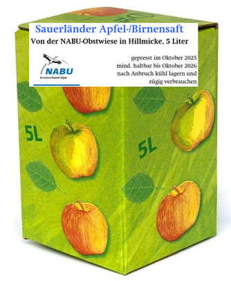 Wir haben in diesem Jahr wieder fleißig geerntet und können nun Apfelsaft und Apfel-/Birnensaft in 5-Liter-Gebinden anbieten. Dieses “Naturschutzprodukt” im Plastikschlauch kostet 10 €, incl. 2 € Pfand für den Karton.